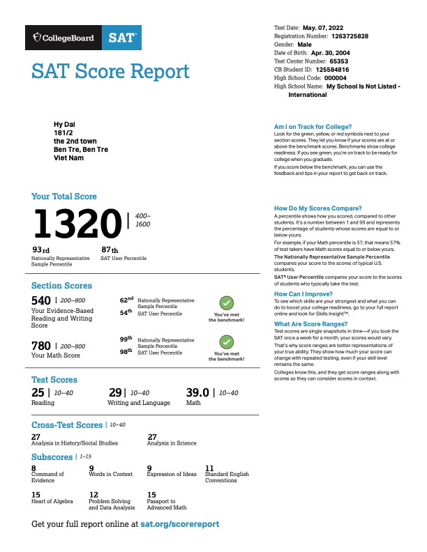 • SAT: 1320/1600 (Math + Evidence-Based Reading & Writing)